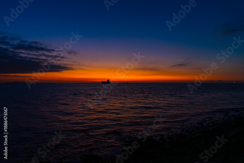 Naklejka premium 夜明けの海と空で朝焼けが映える波間20240105