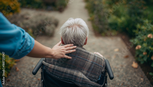© bephoto, Fototapeta premium 小径を見下ろす角度で介護士が肩に手を添え進行を促す朝