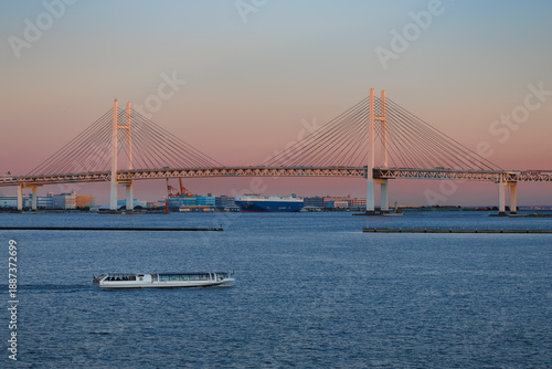Fototapeta premium 横浜港、夕焼けに染まるベイブリッジと行きかう遊覧船