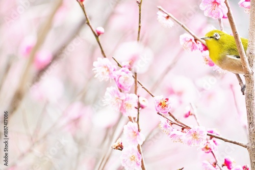 Naklejka premium 冬の満開のピンクの梅の花と可愛い緑の小鳥、メジロ