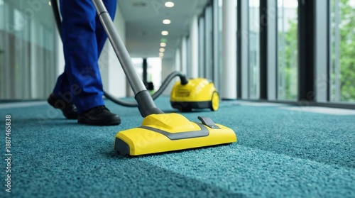 © AnilaStudio, Obraz premium オフィスカーペットを掃除する黄色い掃除機と清掃員の足元