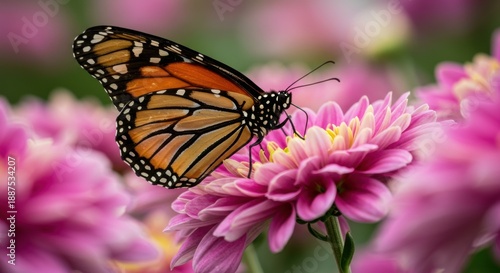 © AnilaStudio, Fototapeta premium ピンクの菊の花に止まるオレンジ色のオオカバマダラ