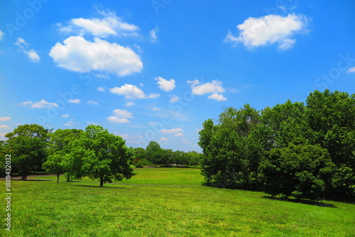 © ken1344, Fototapeta premium 青空、白い雲、緑の木々、芝生の広場、風景1