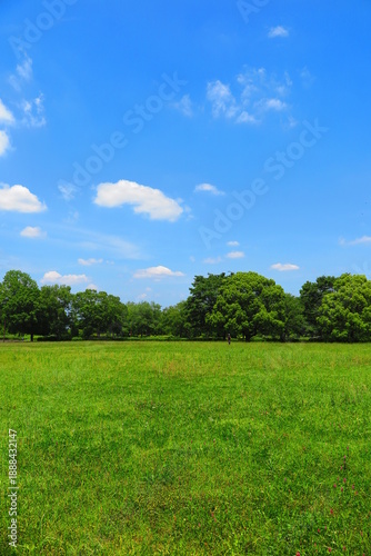 Obraz premium 青空、白い雲、緑の木々、芝生の広場、風景4