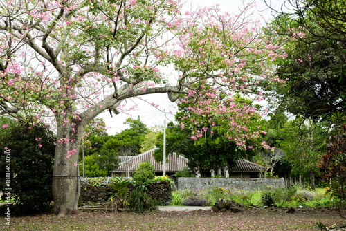 Obraz premium トックリキワタの花と赤瓦の古民家