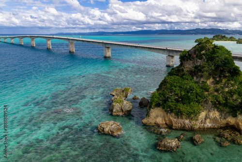 Obraz premium 古宇利大橋とカエル島(ドローンによる空撮)