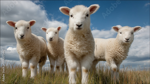 © cassis, Fototapeta premium 青空の下の草原に佇む可愛い子羊 牧歌的な風景と動物の癒やしイメージ