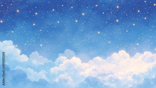 Fototapeta premium 青い夜空と雲のファンタジー背景 星が輝くイラスト