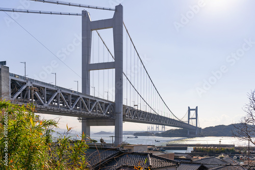 Fototapeta premium 岡山県倉敷市 田土浦坐神社から見た瀬戸大橋と田之浦の街並み