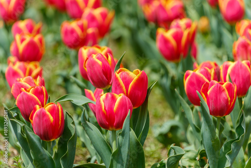 Fototapeta premium 公園の野原に群生する赤と黄色のコントラストが美しいチューリップ