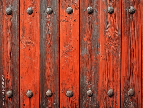 © Jumpei, Fototapeta premium 長い年月を感じさせる赤く塗られた古い木製扉に金具が整然と並ぶ重厚な歴史的建築の一場面