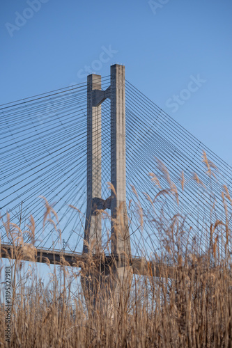 Fototapeta premium 冬の秩父・青空に映える秩父公園橋(秩父ハープ橋)と冬枯れの河原の風景