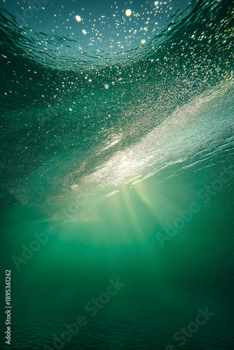 Fototapeta premium 水中から見上げる太陽の光と無数の気泡の背景