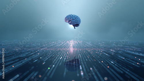 Obraz premium 夜明けの冷たい霧に包まれたデジタル脳、回路の反射が長く伸びる
