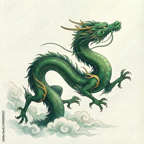 Obraz premium 大空を上昇する緑龍を描いたイラスト