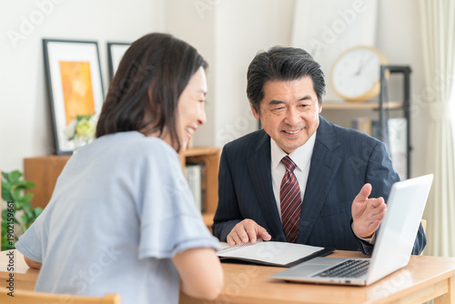 © dimlight, Obraz premium リビングで男性と商談をするビジネスウーマン