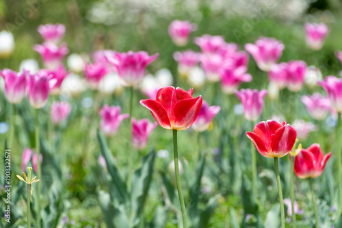 © Kazutaka, Obraz premium 春の公園の花壇で鮮やかに咲く赤いチューリップ