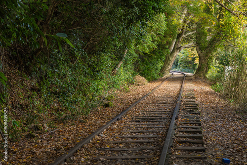 © pespiero, Obraz premium 日本 鳥取県倉吉市関金町にある旧国鉄倉吉線、泰久寺駅の廃線跡の線路と紅葉した木々