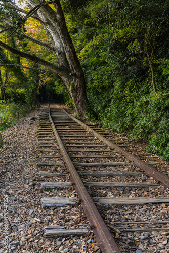 Obraz premium 日本 鳥取県倉吉市関金町にある旧国鉄倉吉線、泰久寺駅の廃線跡の線路と紅葉した木々