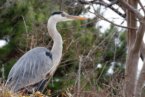 Obraz premium 婚姻色の嘴のアオサギ。繁殖期のアオサギ。木のある冬の風景。