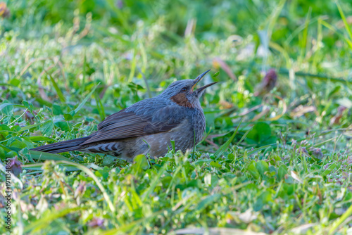 Obraz premium 春の草原でくちばしを開けて餌を探す野鳥のヒヨドリ