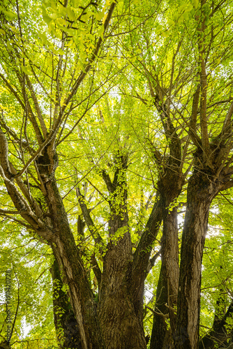 © pespiero, Obraz premium 日本 島根県大田市三瓶町にある浄善寺の黄葉前、ほのかに黄緑色に色づく大銀杏