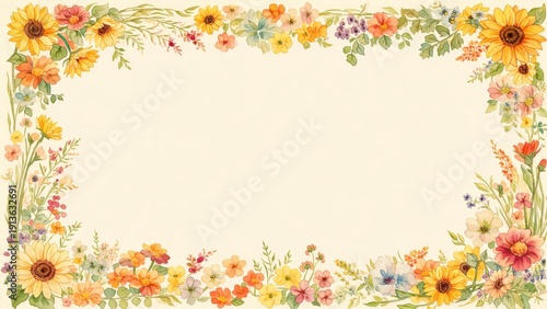Obraz premium ひまわりと草花の水彩フラワーフレーム背景イラスト