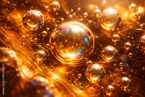 Naklejka premium 黄金アンバーの閉じ込め気泡 × 虹色干渉が宿る静謐マクロ × オーガニック・熟成テーマ向け背景