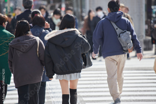 Obraz premium 冬の昼の名古屋の繁華街の横断歩道を渡る若い女性と人々の姿