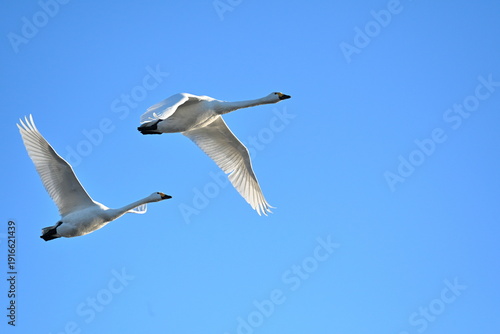 Obraz premium 青空を飛ぶ瓢湖の白鳥(新潟県阿賀野市水原)