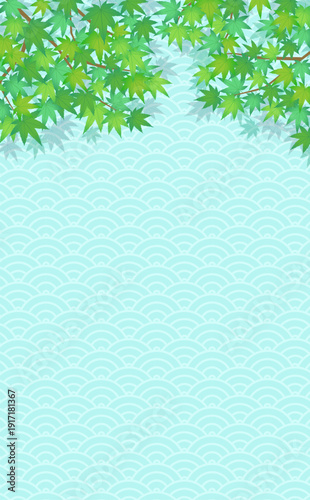 Obraz premium 緑のもみじと和柄の涼しげな背景1_縦