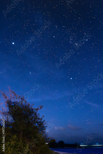 Naklejka premium 2月の宮古島の与那覇前浜で、冬の大三角形と明るく輝く木星を観察