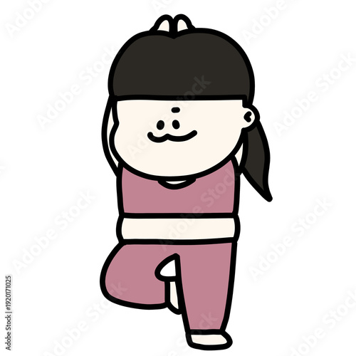 © 右膝に違和感 , Fototapeta premium ピンクのトレーニングウェア姿でヨガの木のポーズをする、やる気満々なぽっちゃり女性のイラスト(背景透過)