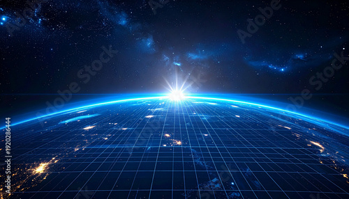 Fototapeta premium 朝日が昇る地球と光のグリッド