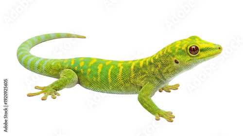 © AnilaStudio, Obraz premium 鮮やかな緑色の皮膚に黄色の縞模様を持つヤモリが、白い背景に分離された状態で横たわっています。赤い目と小さな黒い斑点が特徴です。