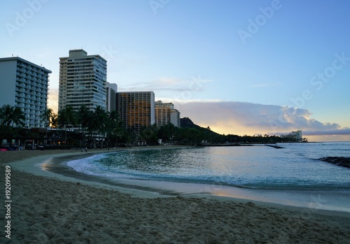 Obraz premium ハワイ 太陽が昇る時刻のワイキキビーチ