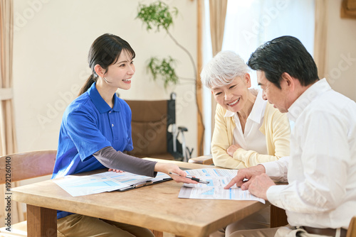 Fototapeta premium 訪問介護でプランの説明をするアジア人介護士