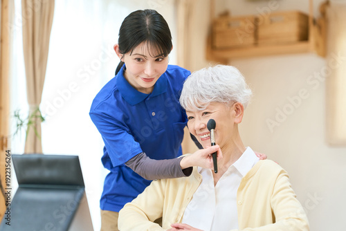 © mapo, Obraz premium 訪問介護でシニアの身だしなみを整える介護士