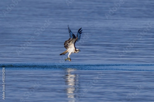 Fototapeta premium 湖で魚を捕らえたミサゴの決定的瞬間。水面から飛び立つダイナミックな野生動物の狩り。