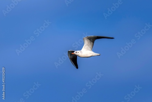 © Scott Mirror, Obraz premium 青空を悠々と飛ぶユリカモメの飛翔シーン、コピースペースのあるミニマルな背景