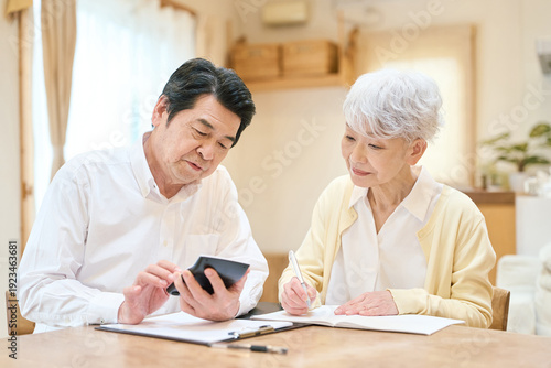 Fototapeta premium 家計の計算をするアジア人シニア夫婦