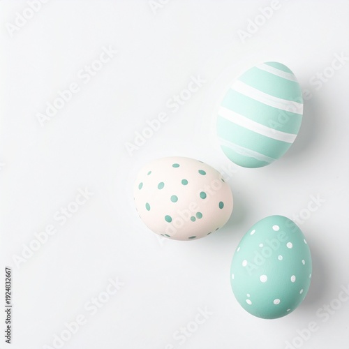 Obraz premium 白背景に3つのパステルカラーのイースターエッグを配置した俯瞰フラットレイ構図。 ストライプとドットのシンプルな柄で、モダンなコーポレートデザインに対応。 広いネガティブスペースを活かし、広告やバナーに最適。