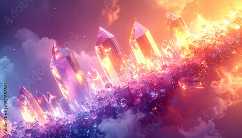 © LuckyStride, Fototapeta premium 斜めに連なる紫橙グラデーション結晶と煙と星空