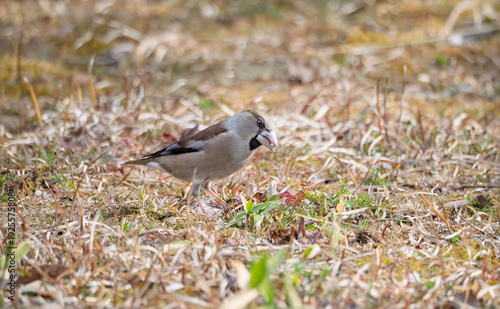 Obraz premium 冬の陽光を浴びて、一心に餌を啄むシメの姿