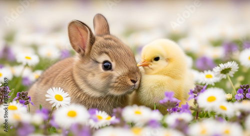 Fototapeta premium ウサギとヒヨコが花畑で寄り添い穏やかに光を浴びる