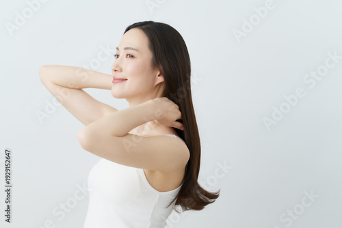 Obraz premium ロングヘアの髪の毛に手を触れる若い日本人女性 ビューティ