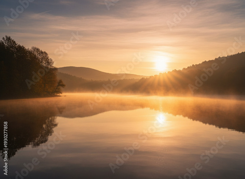 Obraz premium 山間の湖と夕日