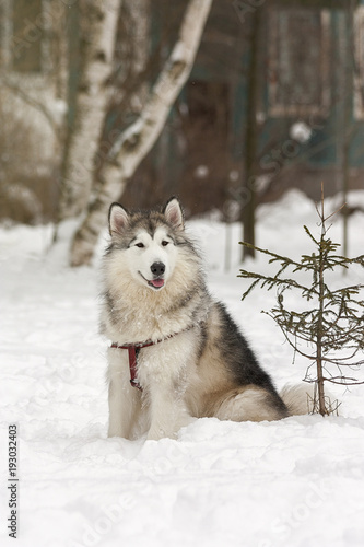Naklejka premium Аляскинский маламут сидит на снегу рядом с елкой