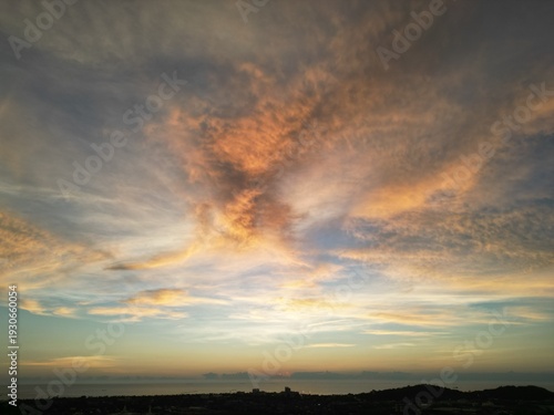 Fototapeta premium 불타는 구름과 강렬한 붉은 노을이 하늘을 뒤덮은 태국 방센의 환상적인 저녁 노을 파노라마 전경