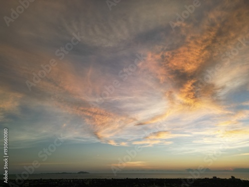 © rokacaptain, Obraz premium 불타는 구름과 강렬한 붉은 노을이 하늘을 뒤덮은 태국 방센의 환상적인 저녁 노을 파노라마 전경